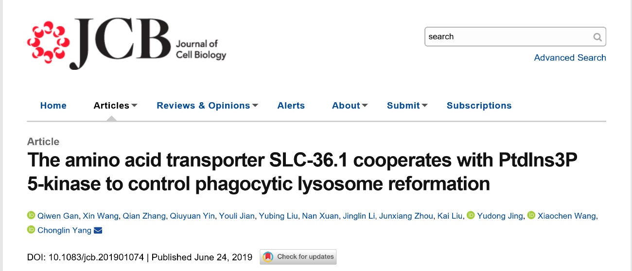 2019年6月24日,细胞生物学著名期刊The Journal of Cell Biology以Article形式在线发表了best365官网登录入口/best365官网登录入口学院杨崇林实验室的研究论文“氨基酸转运蛋白SLC-36.1协同磷脂酰肌醇-3磷酸激酶调控吞噬溶酶体的再形成”(The amino acid transporter SLC-36.1 cooperates with PtdIns3P 5-kinase to control phagocytic lysosome reformation)。