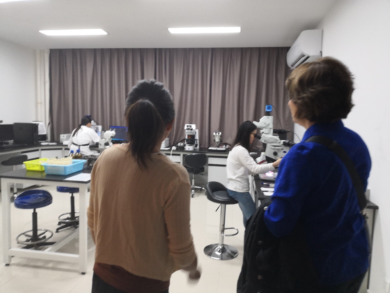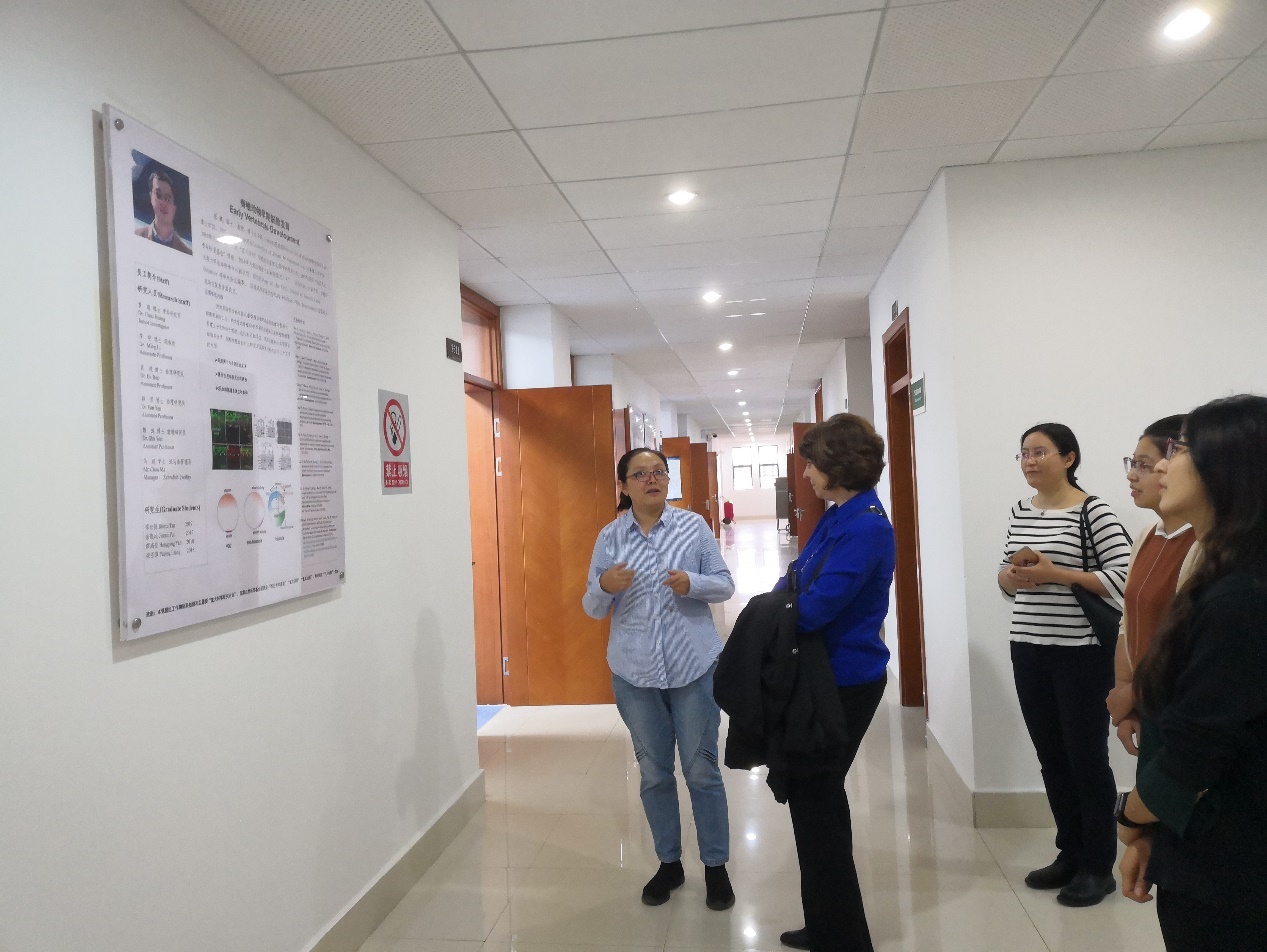 Dr.Beverly Pumell走进张建老师的脊椎动物早期胚胎发育及干细胞研究课题组,贲进老师介绍实验室目前主要从事卵母细胞中母源因子对胚胎早期发育影响的研究,特别是对这些因子如何调控生殖质的形成和原始生殖细胞的发生与分化有莫大兴趣。随后,一行参观了斑马鱼房、中心公共显微成像平台。