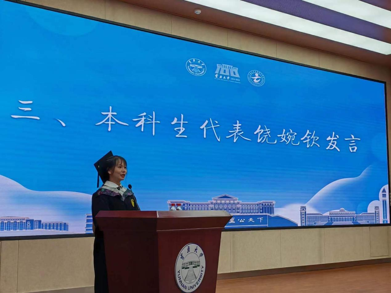 本科毕业生代表饶婉钦同学发言。她感谢母校和学院为学子提供了广阔的平台,让其有机会在科研中勇敢试错、在青春舞台上大展宏图。并感谢老师们孜孜不倦的教诲、感谢同窗好友们的陪伴。她说,在未来的道路上要继续奋勇前行,永不忘记作为一名云大人所肩负的责任和担当。