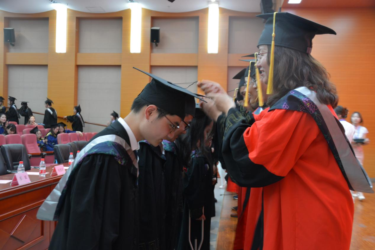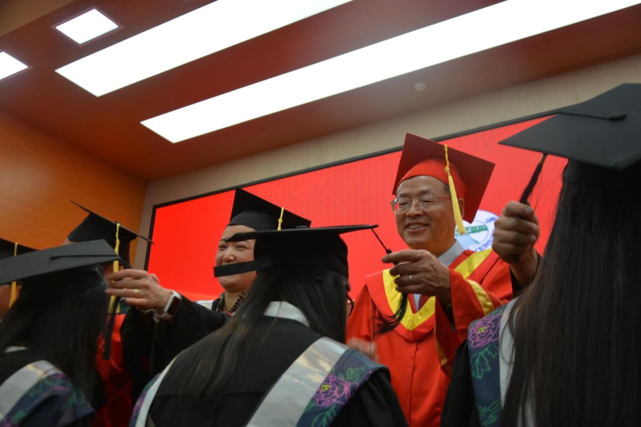 院长同导师代表身着红袍陆续上台,与同学们共同完成拨穗礼环节,并将毕业证郑重的交到同学们手里,同时还不忘询问同学们的情况,眼神里满满都是关心与祝贺。