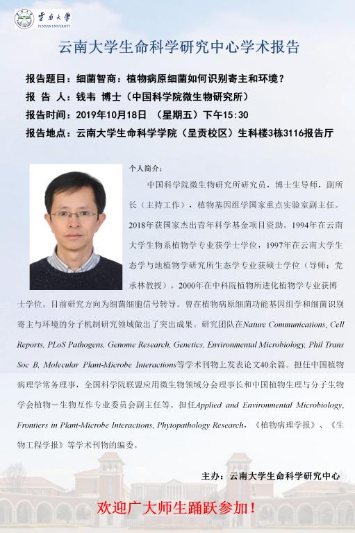 当前位置: 首页>>新闻通知>>通知公告>>正文 best365官网登录入口学术报告 - 中国科学院微生物研究所钱韦研究员 “细菌智商:植物病原细菌如何识别寄主和环境” 发布时间: 2019年10月17日 09:22 阅读次数: 报告题目:细菌智商:植物病原细菌如何识别寄主和环境? 报 告 人:钱韦 博士(中国科学院微生物研究所) 报告时间:2019年10月18日 (星期五)下午15:30 报告地点:best365官网登录入口(呈贡校区)生科楼3栋3116报告厅